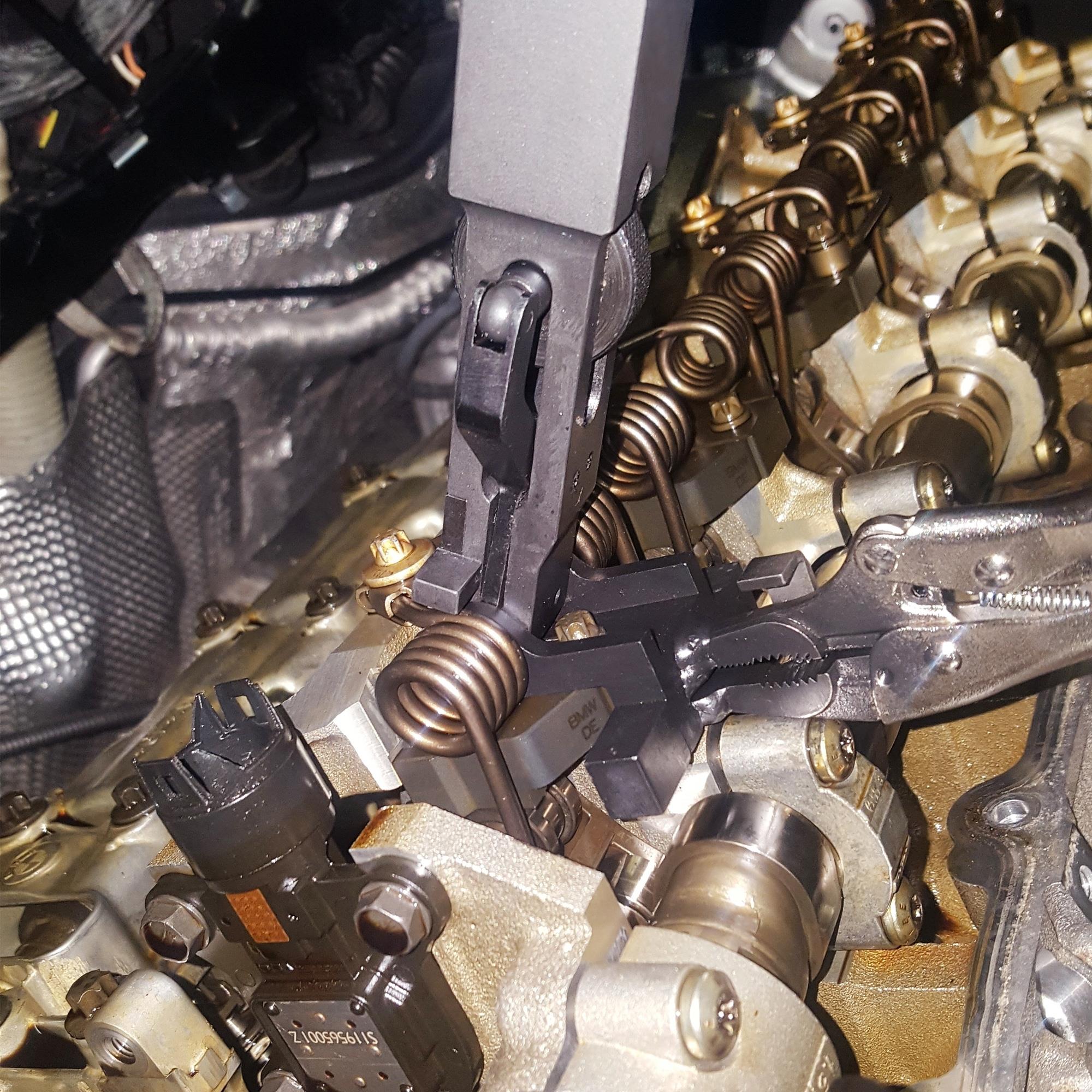 Този специален инструмент за демонтаж и монтаж на натискателните пружини на междинния клапанен лост (Valvetronic) осигурява бърза, лесна и безопасна работа с тези силно натегнати пружини.