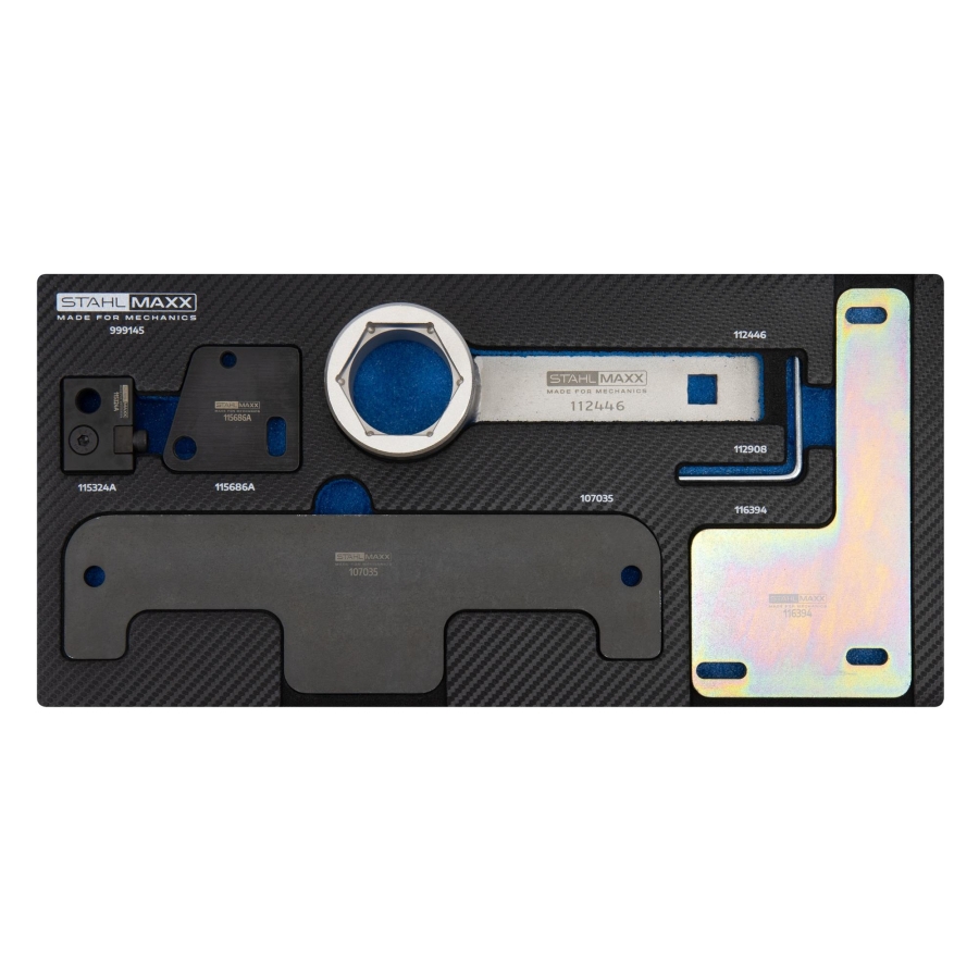 Този комплект инструменти за ангренажна верига е предназначен за точно фиксиране и настройка на компонентите на двигателя при VR5 и VR6 бензинови двигатели, използвани в VAG, Porsche и Ford автомобили.