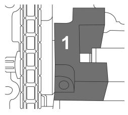 Завъртете разпределителния вал с ключа, докато изрезите на регулиращия инструмент (1) могат лесно да се поставят върху профила (D) на вала.