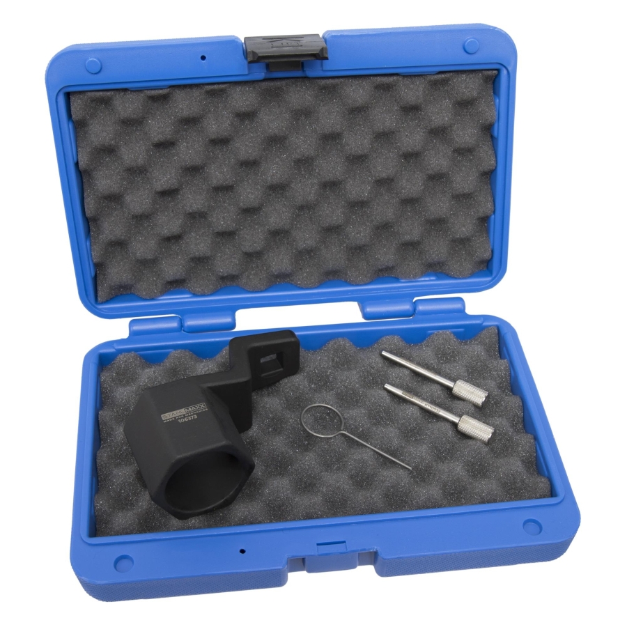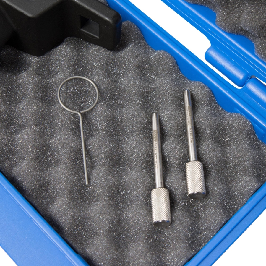 Комплектът включва всички необходими инструменти за работа по разпределителния вал, шайбата на коляновия вал и обтегача на веригата, позволявайки цялостно обслужване на двигателя.