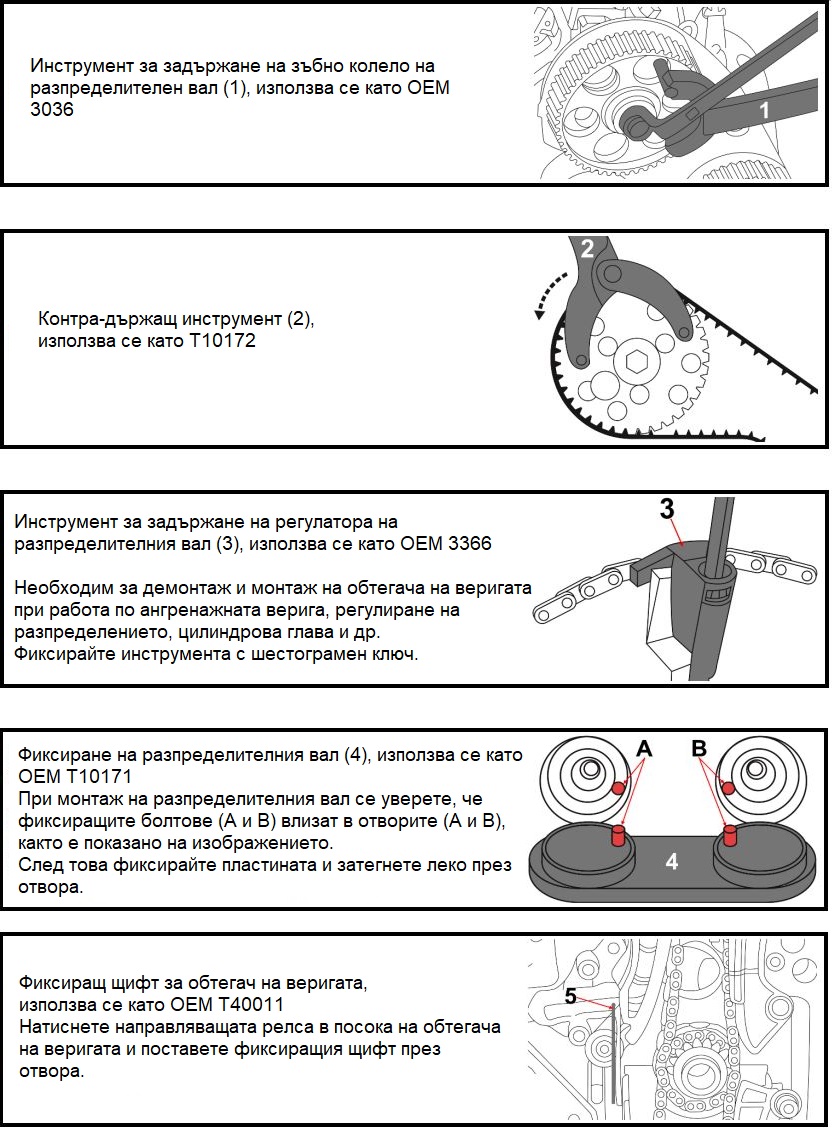✔ Включва инструменти за фиксиране на разпределителен и колянов вал