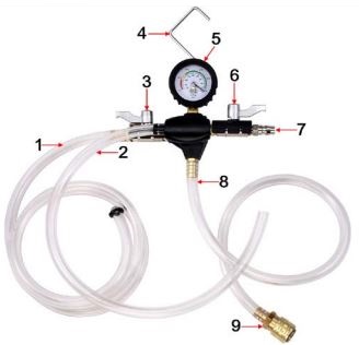 Устройството използва компресиран въздух за създаване на вакуум в охладителната система, което позволява бързо и ефективно пълнене без необходимост от ръчно обезвъздушаване.