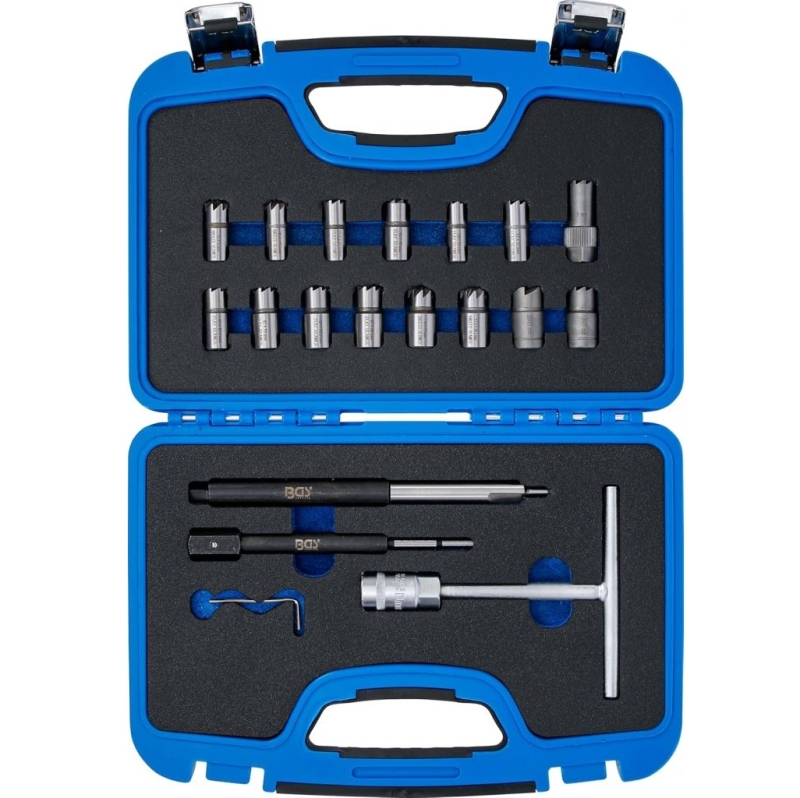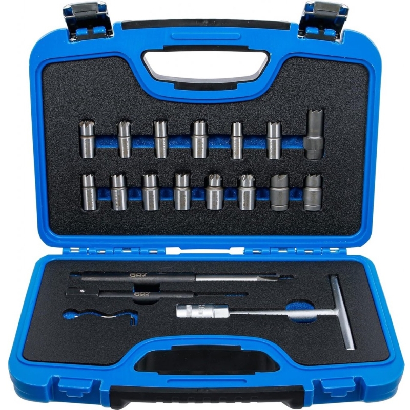 Професионален комплект с 19 части за фрезоване на отвори и седла на инжектори за Common Rail дизелови двигатели. Осигурява чисти и равни уплътняващи повърхности в цилиндровата глава и инжекторите, намалявайки риска от течове, натрупване на сажди и загуба на мощност.