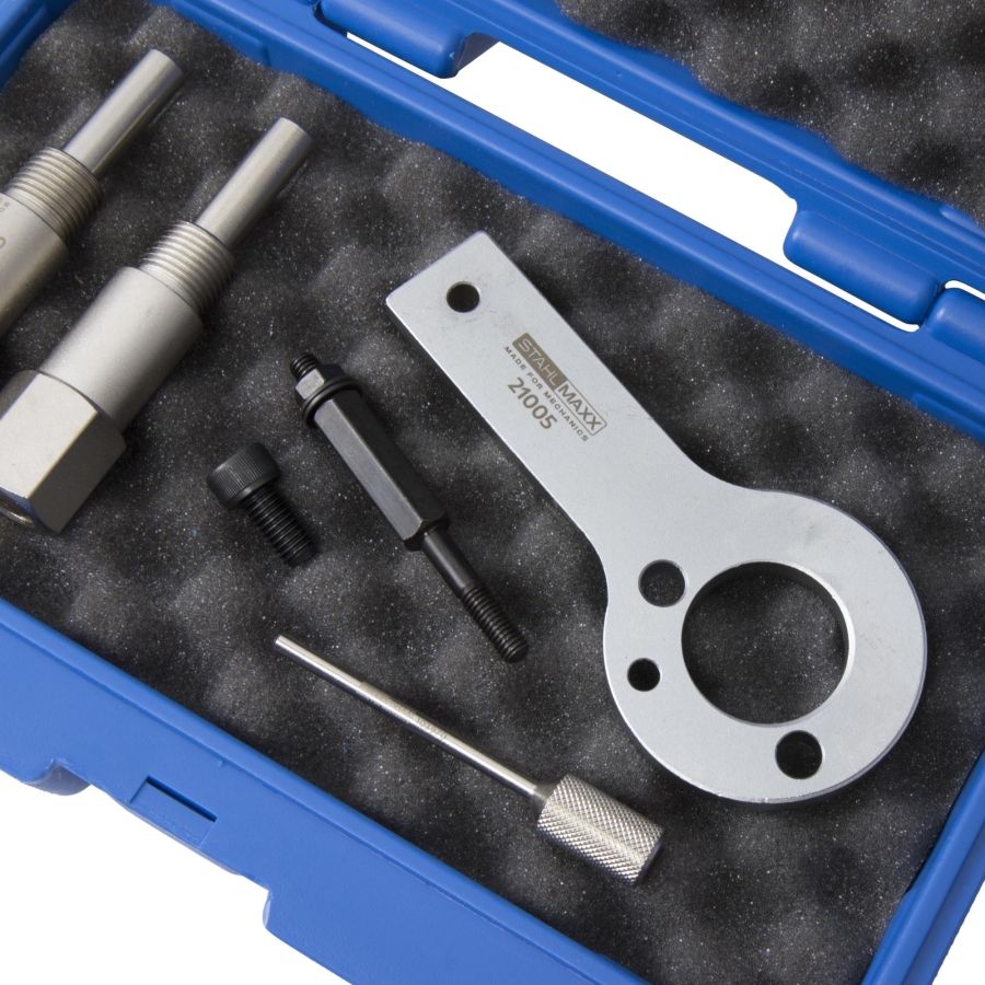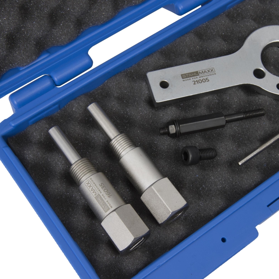 Този професионален комплект е предназначен за прецизна смяна на ангренажен ремък и обслужване на двигатели Saab, Fiat, Opel и Alfa 1.6–2.4 JTD/CDTi. Позволява надеждно заключване на разпределителен вал, колянов вал и ролка за безопасни и точни ремонти на двигателя.