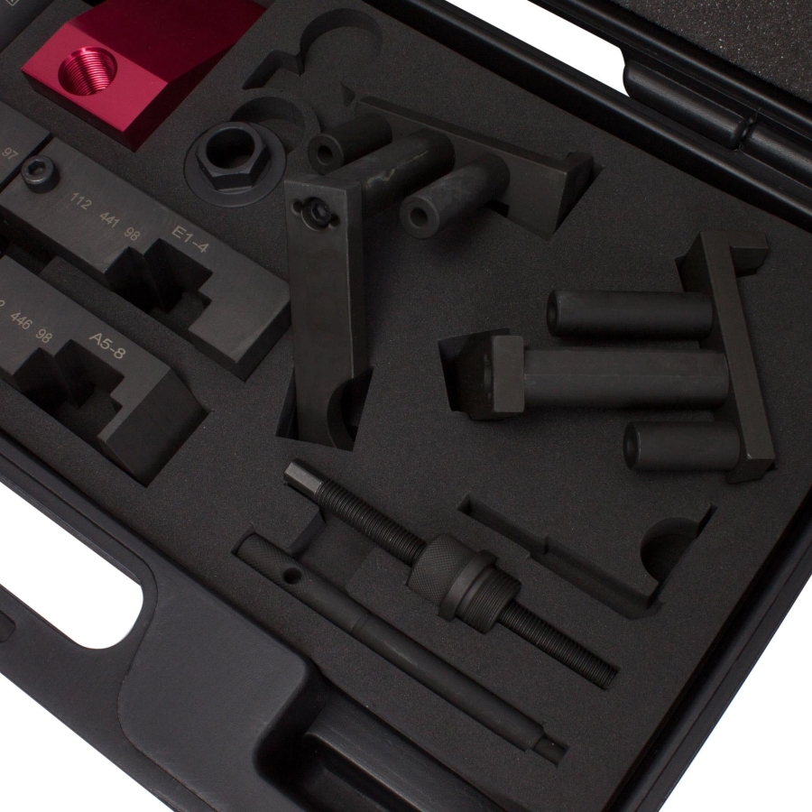 This professional engine timing tool kit is specifically designed for precise adjustment and locking of timing components on BMW V8 engines. It enables accurate positioning of the camshaft, flywheel, timing chain tension system, and VANOS units during maintenance and repair operations.