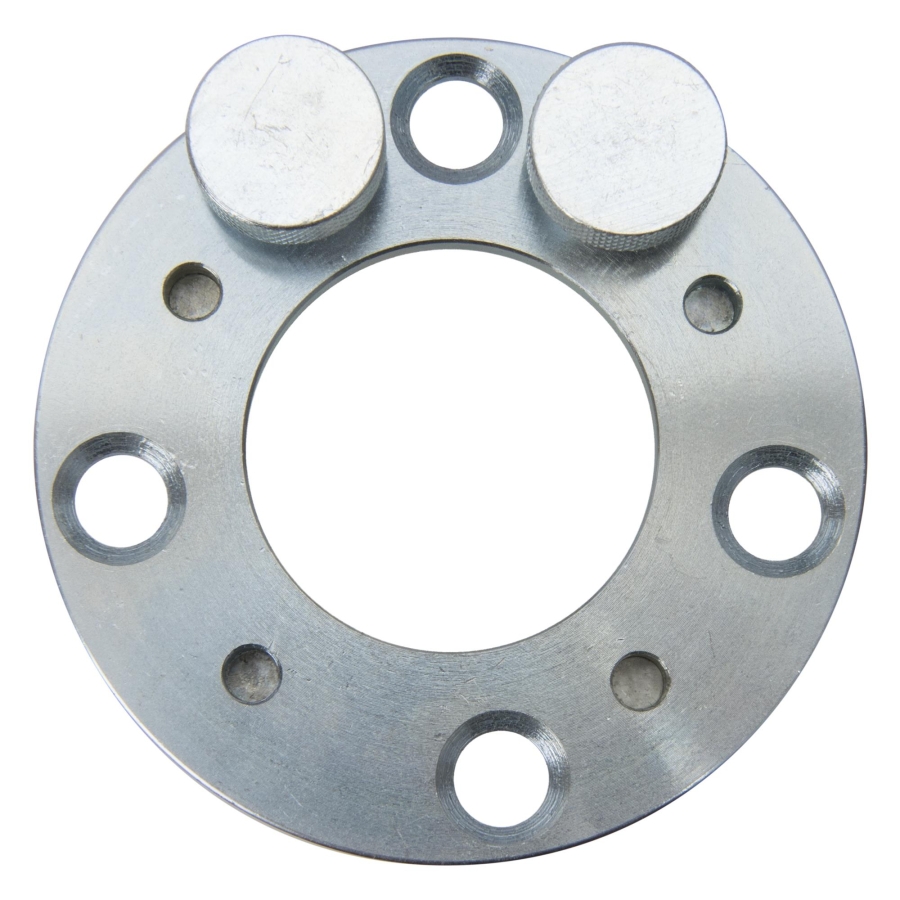The adapter is mounted onto a standard 2-pin counterhold tool and fixed using the included knurled screws. It engages directly into the camshaft adjuster via four mounting points, allowing secure counterholding during service operations.