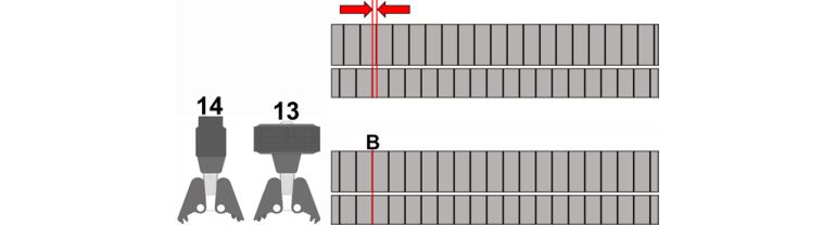 Depending on the application, place alignment clamps 13 and 14 onto the teeth of the exhaust camshafts so that both arms of the alignment clamp engage with the teeth of both halves of the gear.