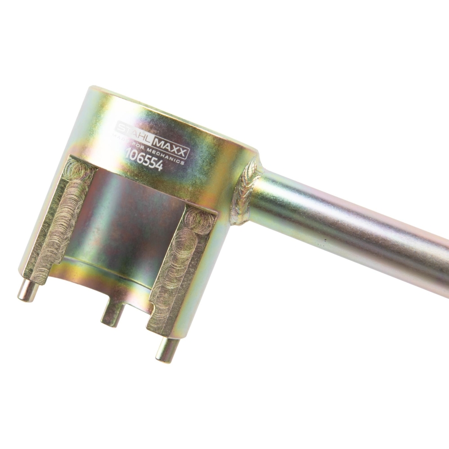 Specialized counterhold tool used for securing the camshaft sprocket during removal and installation. Prevents unwanted rotation and allows controlled handling of fasteners.