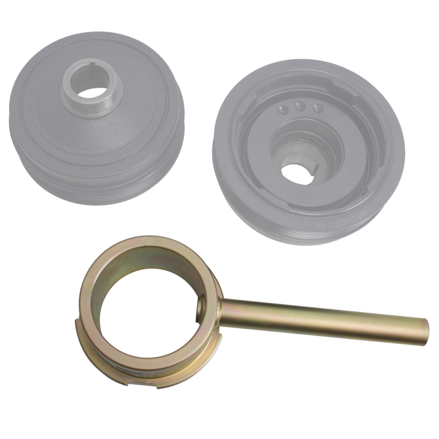 This tool is used as a counterhold for the crankshaft pulley during engine repair and maintenance.