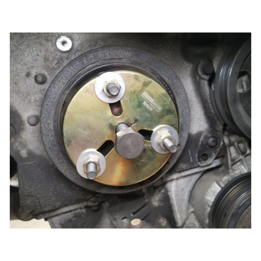 This specialized puller tool is developed for safe removal of the crankshaft pulley (harmonic balancer) on Mini W10 and W11 engines. It enables controlled extraction while minimizing the risk of damage to the crankshaft and surrounding components.