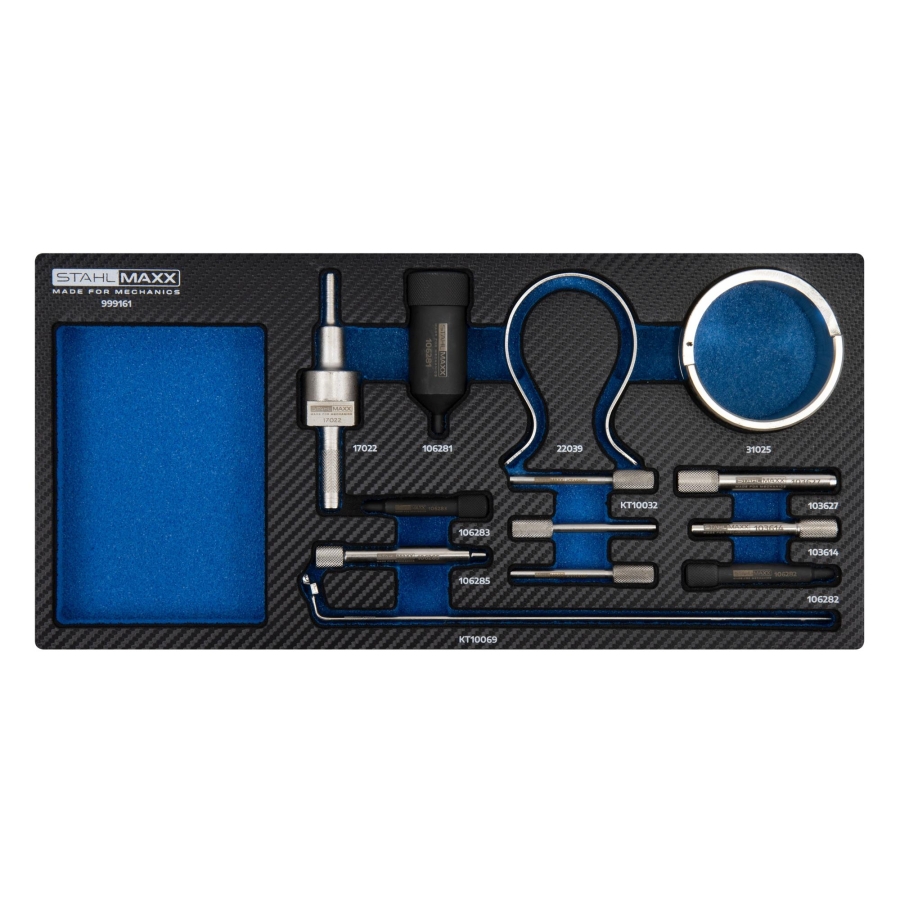 Професионален комплект за смяна на ангренажна верига и прецизна настройка на времето на 1.4–2.2L 4-цилиндрови двигатели от Citroën, Ford, Fiat, Peugeot, Opel, Suzuki, Volvo и Toyota. В комплекта е включен здрава кутия с формован пяна, която може да се използва и като тавичка за работилница.