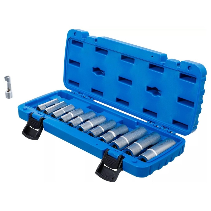 Professional 12-piece slotted socket set for temperature sensors, thermo switches, and lambda sensors. Slotted design allows safe access to wired sensors in tight spaces.