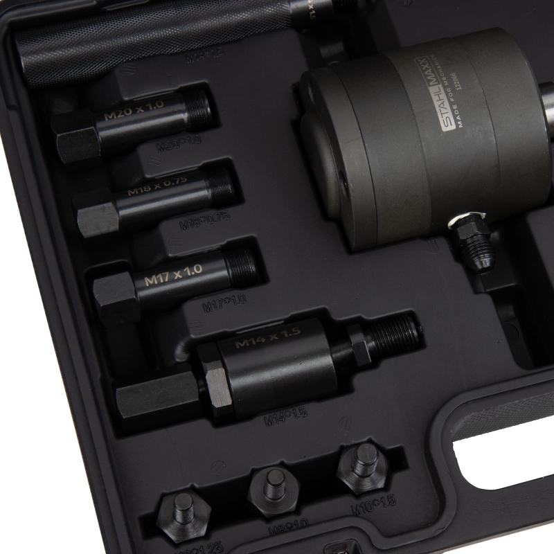 The tool kit includes a comprehensive set of threaded adapters compatible with most passenger car and van injector types, making it a universal and cost-effective solution for workshops and service technicians.