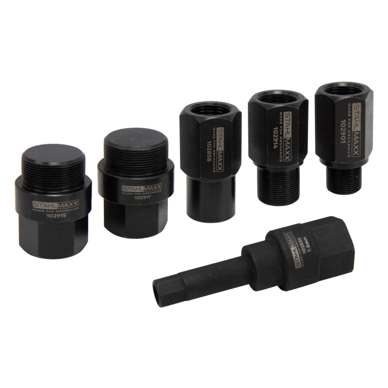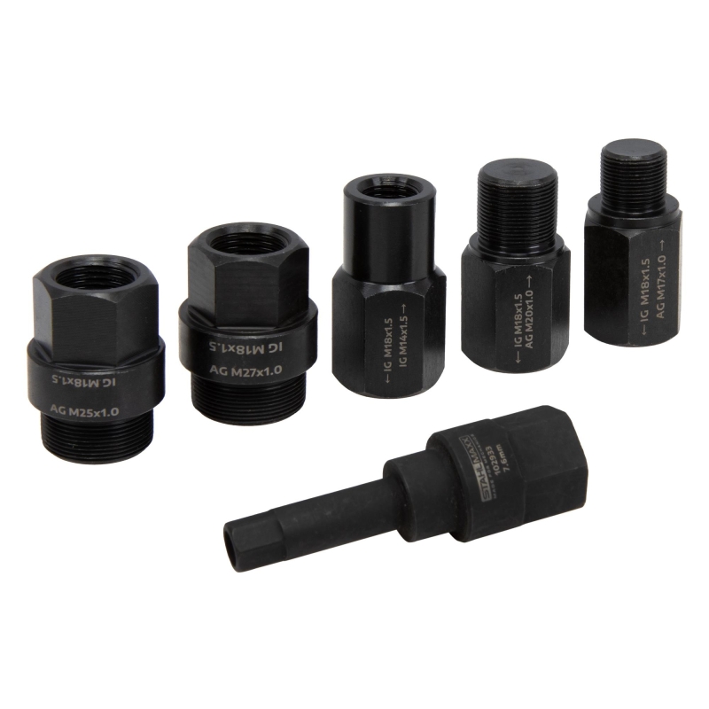 The Injector Puller Adapter Set M18, 6 Pieces, is a robust and versatile tool kit designed for professional workshops to simplify the removal of stuck or difficult-to-access diesel injectors. Equipped with M18 x 1.5 coupling threads, this set is specially engineered for use with impact hammers, such as Art-Nr. 100540 or 116181.