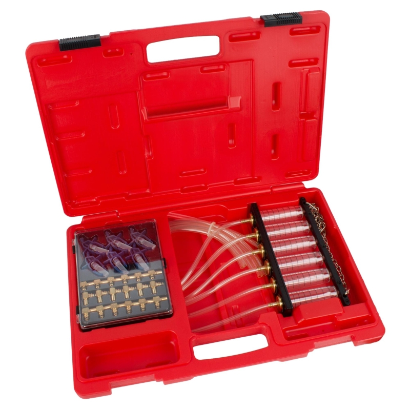 Professional return flow meter for common rail engines with solenoid injectors. Includes 6 measuring cups with 70 cm hoses and 24 adapters for Denso, Bosch, Siemens, and Delphi injectors. Ideal for workshops and advanced hobbyists to quickly locate faulty injectors.