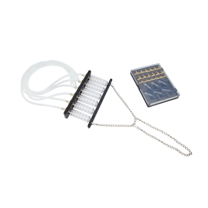 6 measuring cups, each with 70 cm connection hoses, mounted on a sturdy aluminum bar with hooks