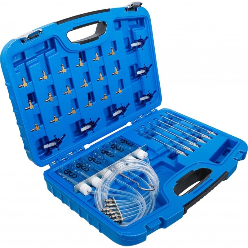 Professional test kit for measuring and comparing return flow volume on common rail injectors. Allows fast identification of faulty injectors using visual or precise measurement methods. Compatible with engines up to 6 injectors.