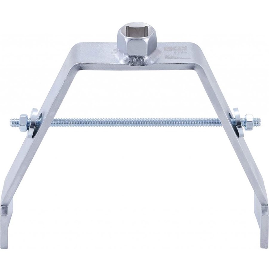 Special tool for removing and installing the locking ring on fuel sender units for Peugeot and Citroën. Features dual input profiles of 12.5 mm (1/2") and 21 mm.