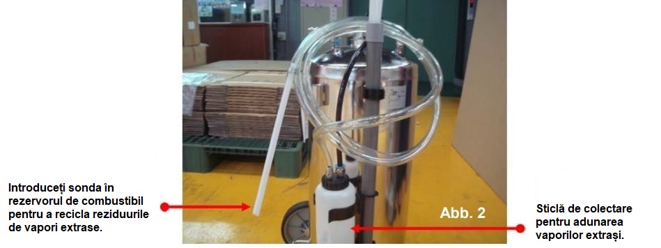Notă: Vaporii extrași din conducta Venturi sunt colectați lateral în recipientul de colectare. Utilizatorul trebuie să scoată sonda de colectare din recipient și să o introducă în orificiul de alimentare cu benzină/diesel al vehiculului pentru a recicla vaporii rămași.