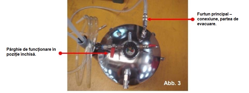 În timpul funcționării, manometrul de vid ar trebui să indice aproximativ 500 mm Hg. Odată ce vidul începe să scadă, procesul este complet (aerul a fost aspirat în mașină). Închideți supapa de aer și fixați mânerul înapoi în suport.