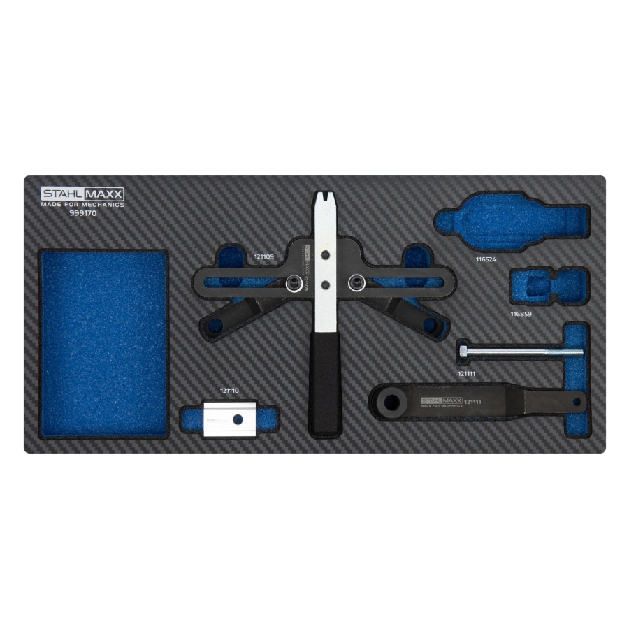 Set de scule specializate pentru blocarea arborelui cotit și a volantei la motoare BMW. Conceput pentru a rezista la cupluri ridicate în operații precum înlocuirea amortizorului de vibrații, schimbarea lanțului de distribuție sau înlocuirea simeringului arborelui cotit.