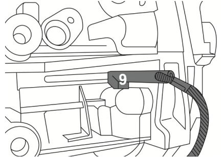 Pentru blocarea arborelui cotit în poziția de reglaj, îndepărtați dopul de închidere din blocul motor și introduceți știftul de blocare în orificiul blocului.