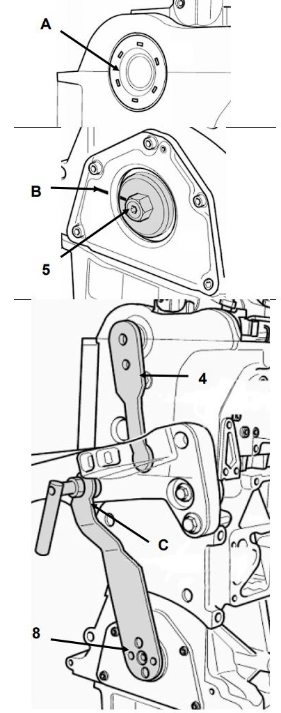 Notă: Unghiul de blocare al dispozitivului pentru arborele cotit (8) trebuie să se angajeze în suportul motor (C) de pe blocul cilindrilor.