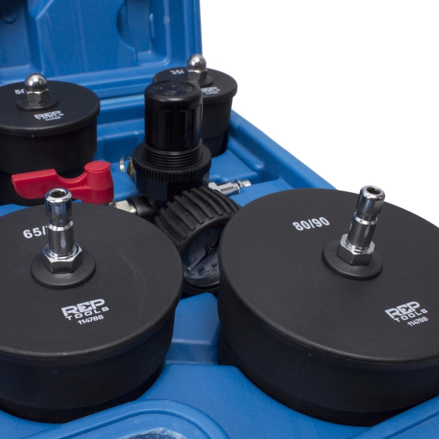 Spre deosebire de soluțiile de bază, setul include regulator de presiune cu manometru, permițând menținerea presiunii pentru perioade mai lungi și localizarea exactă a scurgerilor.