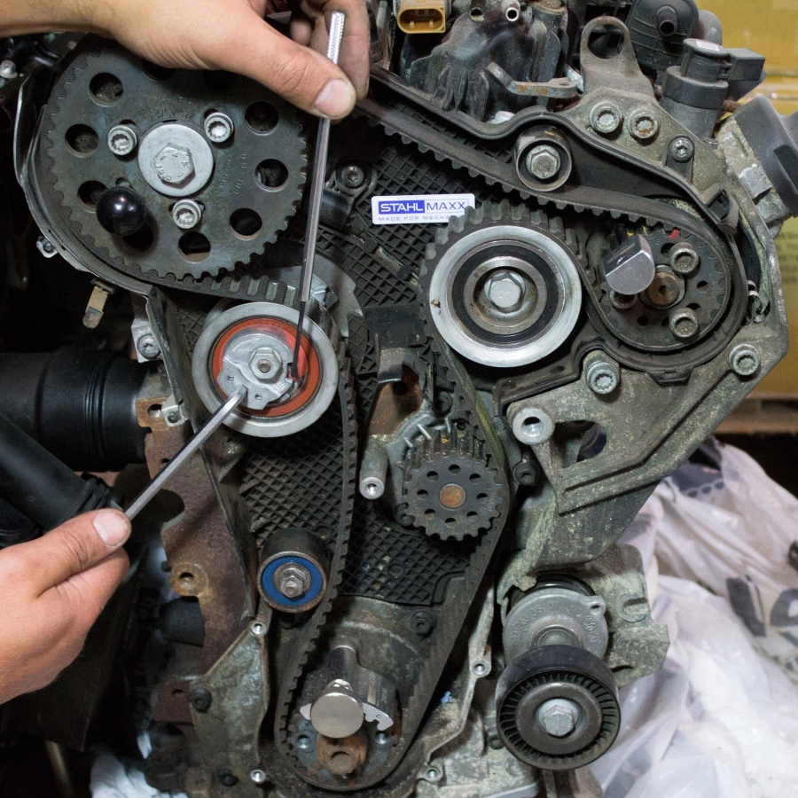 Unealta fixează rola întinzătoare în timpul demontării și montării curelei de distribuție. Astfel se previne mișcarea nedorită și se asigură poziționarea corectă a curelei în timpul lucrărilor de service.