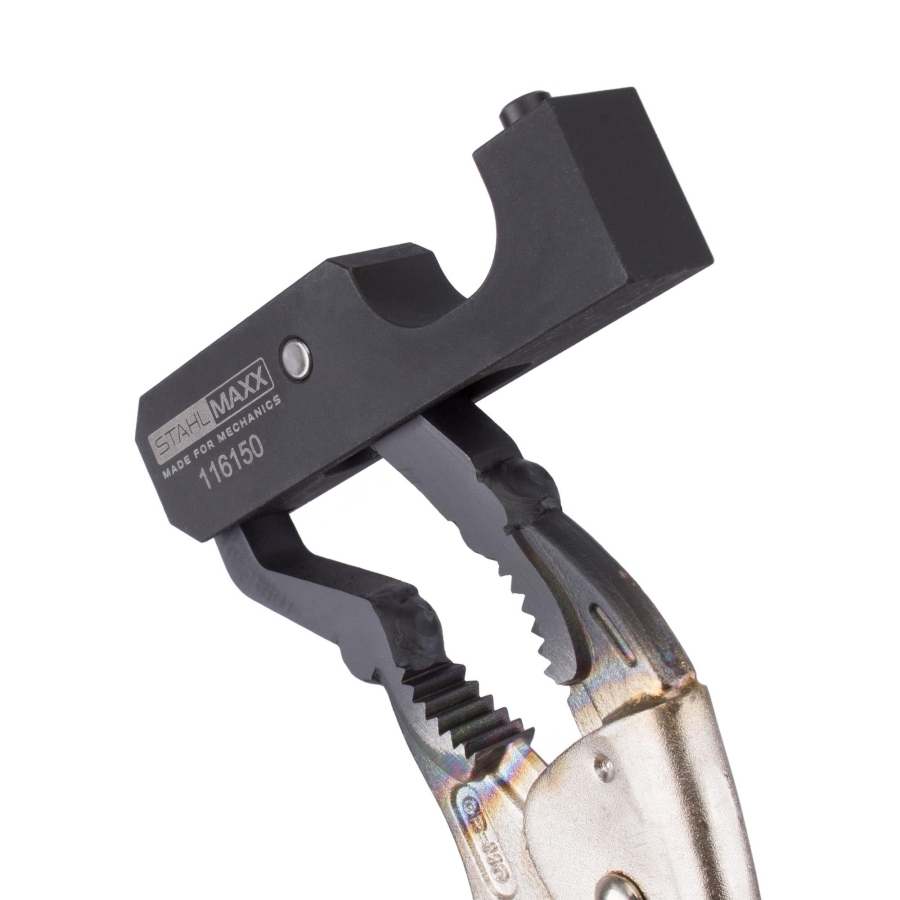 This specialized plier tool is designed for preloading and releasing the Valvetronic torsion springs in BMW engines.