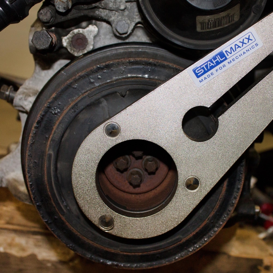 The tool is fixed to the mounting point of the idler pulley and simultaneously engages with the teeth of the crankshaft pulley. This setup allows controlled loosening and tightening of the vibration damper bolts.