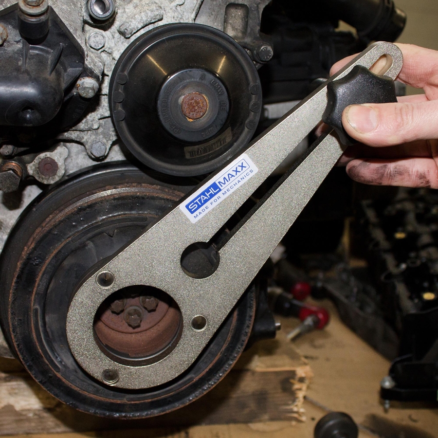 This holding tool is designed to counter-hold the vibration damper (crankshaft pulley) during removal and installation of the mounting bolts on BMW and Mini N47 and N57 engines.